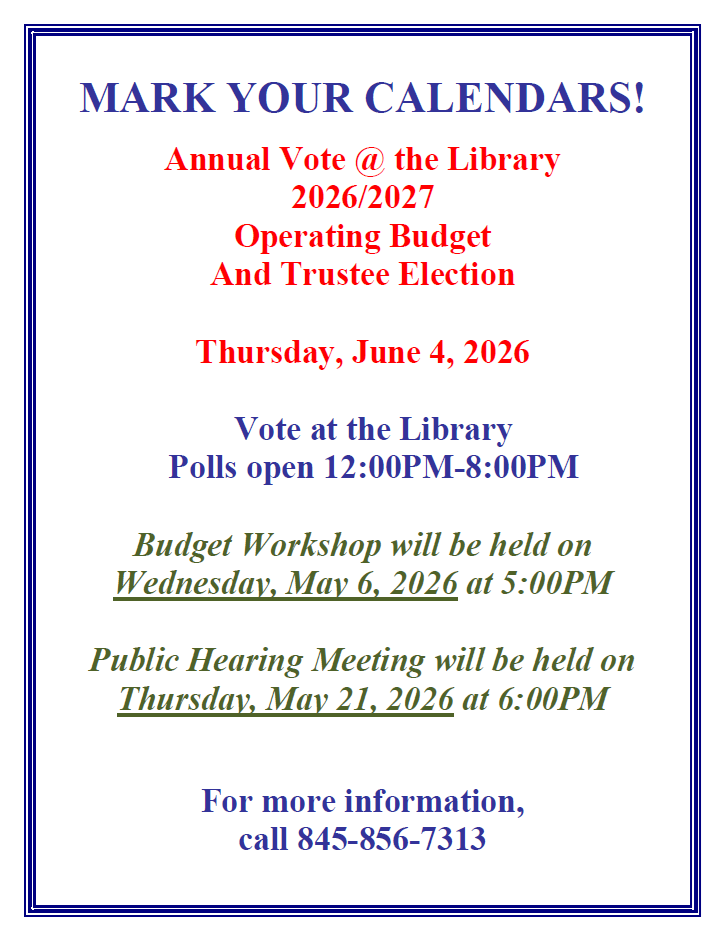 Agenda for upcoming board meeting will be posted at least 48 hours before the meeting. Unless otherwise noted, in-person meetings will be held at the Port Jervis Free Library located at 138 Pike Street, Port Jervis NY 12771. In-person meetings are scheduled from 6:00 PM - 8:00 PM. All Board Meetings are open to the public.